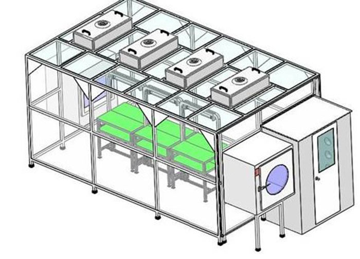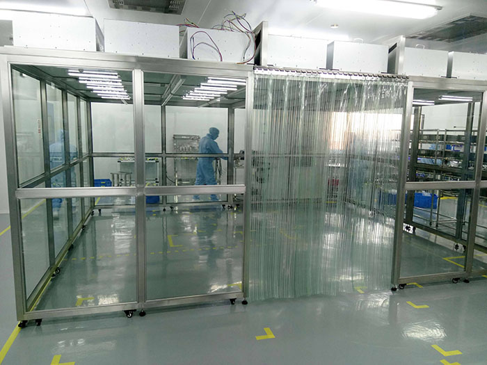 百級(jí)潔凈棚-無(wú)塵工作站一般以工業(yè)鋁材(不銹鋼方通、噴塑方通)做框架,采用風(fēng)機(jī)濾網(wǎng)機(jī)組FFU送風(fēng),四周采用防靜電垂簾,頂部鋪蓋密縫盲板,形成一個(gè)密縫區(qū),內(nèi)部?jī)艋?jí)別可達(dá)100---10萬(wàn)級(jí);特別適用于車(chē)間內(nèi)局部對(duì)潔凈度要求高的區(qū)域,如流水線作業(yè)區(qū)的高精確度產(chǎn)品組裝區(qū)。